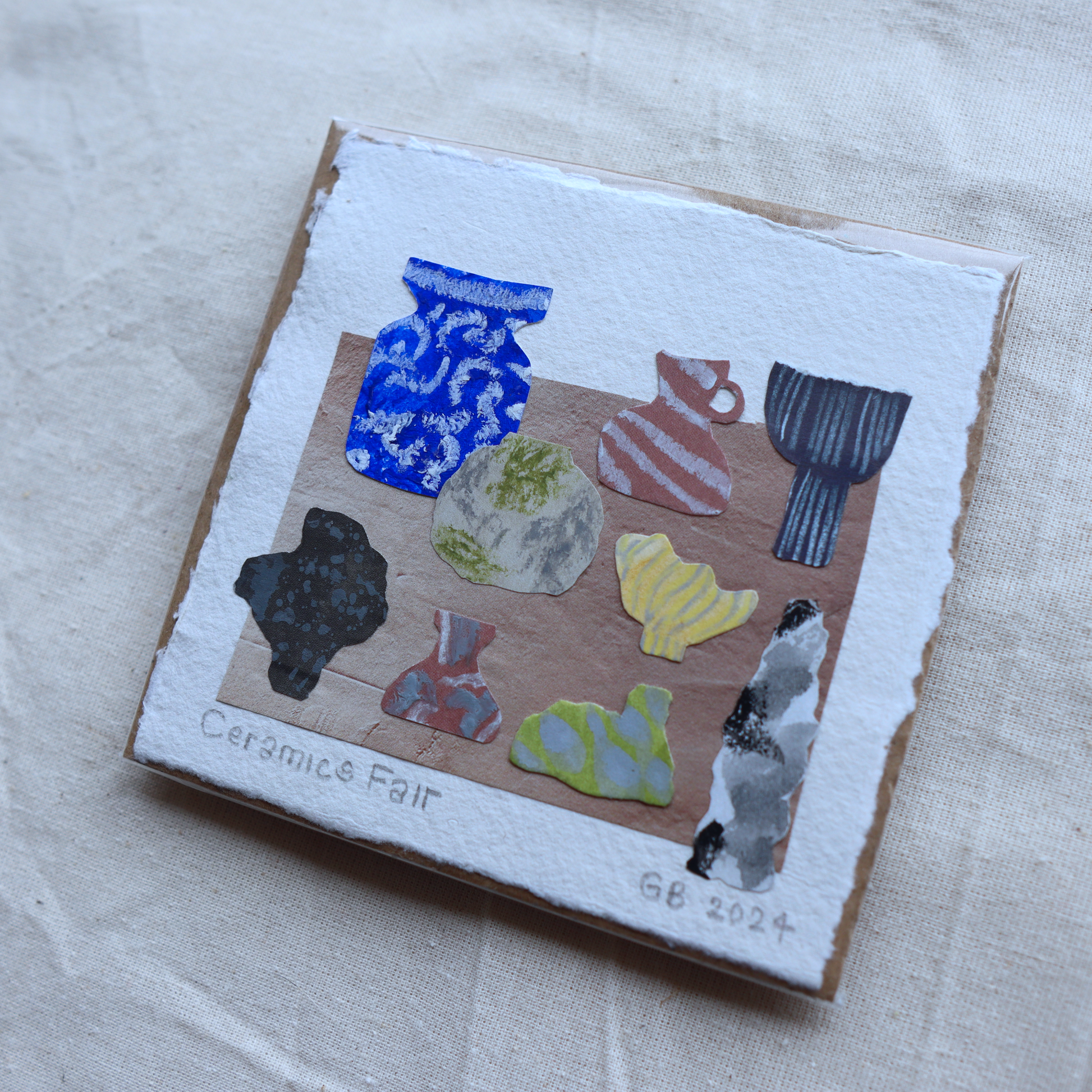 Original Collage on Cotton Rag Card 'Ceramics Fair' 10.5cm x 10.5 cm