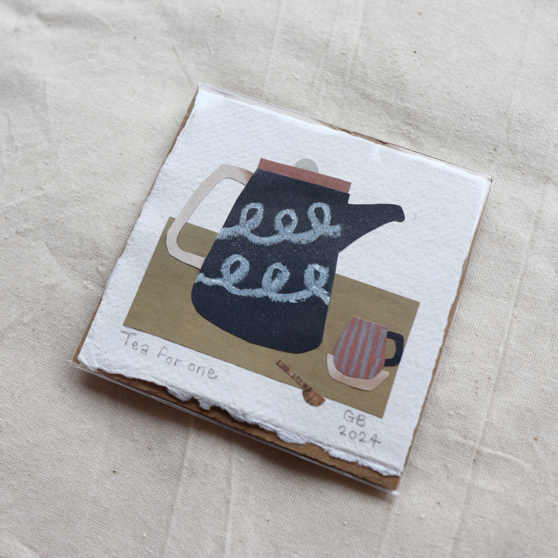 Original Collage on Cotton Rag Card 'Tea for One' 10.5cm x 10.5cm